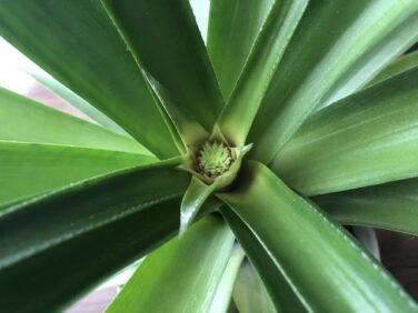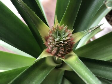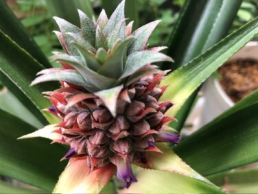 パイナップルのつぼみの先端が紫色になってきて数日後、ついに花が咲きました。パイナップルの花は、紫色で、いくつもの花がぐるっと囲むようにして咲きます。花が咲く前から小さなパイナップルの形をしていましたが、その状態はまだつぼみだったようで、この紫色の花がパイナップルの花でした。パイナップルの基本情報パイ...